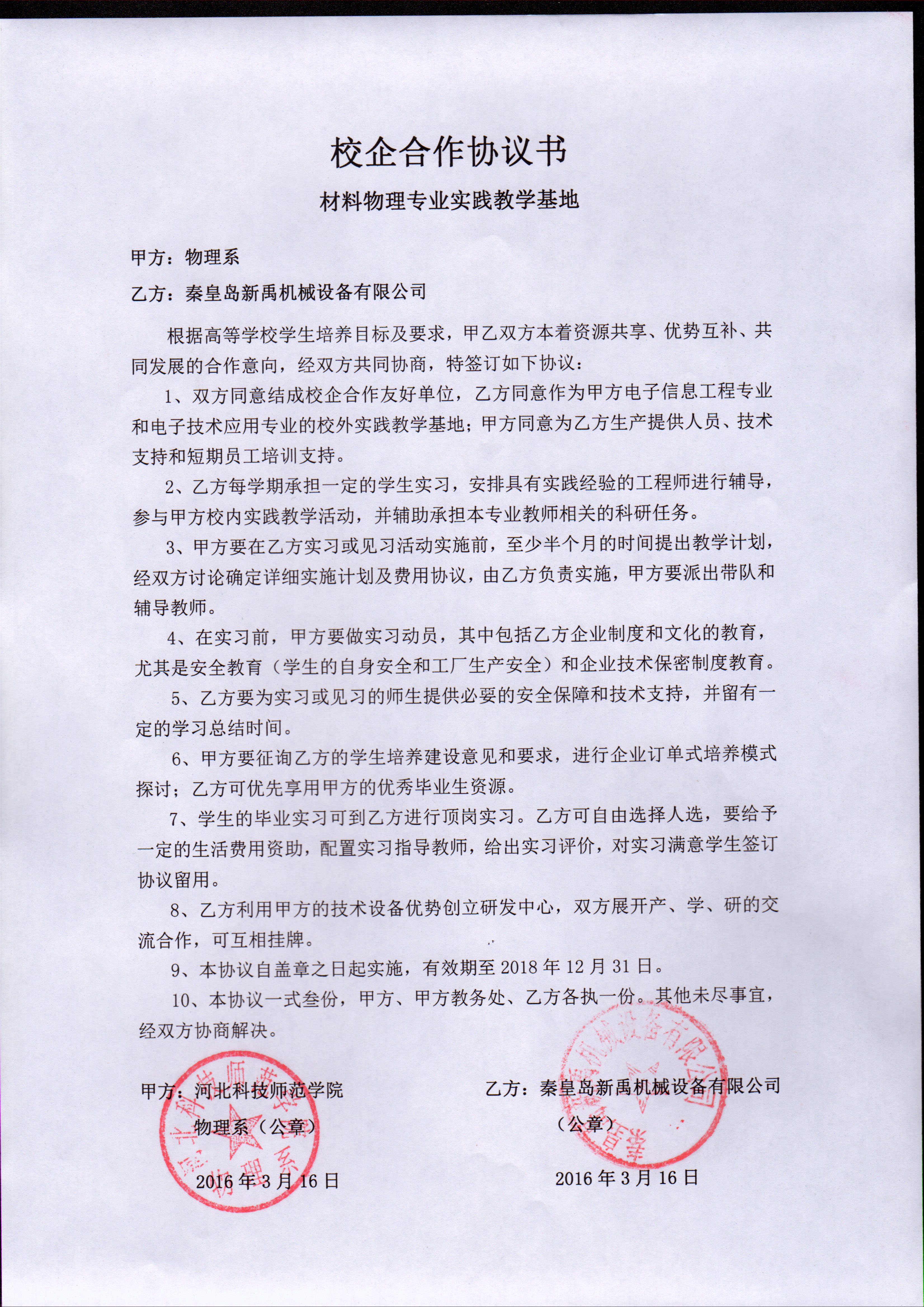 物理系建立秦皇岛新禹机械设备有限公司校外实习基地